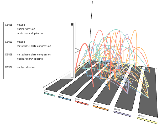 In 3D arc mode, clicking on an individual arc will pop-up a window that displays the names and associated information (i.e. gene ontology terms, if loaded) for each gene involved in the respective connection.